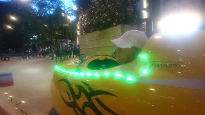 Bij het Smurfendorp hielden we een ijsjes pauze. En moesten Ed en ik om de beurten oppassen op de fietsen, en vooral de kinderen met een ijsje bij de fietsen weghouden. Die houden gewoon hun ijsje boven het instapgat, wat ik niet een heel fijn idee vond. Hier was het ook ineens heel druk met auto's. Wie bedenkt nou, dat je een lichtjestocht die door de stad en woonwijken is uitgezet met de auto gaat rijden! Nou ja, van mij mogen ze bepaalde delen wel afzetten zodat je er niet meer met de auto door kan. Want heel veilig is het nou ook weer niet als je met een velomobiel daarlangs moet rijden in een wijk waar een fiets en auto net langs elkaar kunnen. Wat dan wel weer leuk is, dat die auto's dus gewoon in de file staan en jij als fietser door kan rijden ;-).